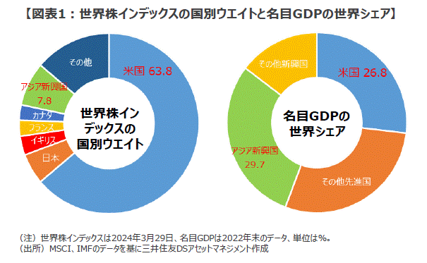 ■足元で世界株インデックスに占める米国株のウエイトは約63.8%に上ります(2024年3月末時点)。一方、世界経済に占める米国経済のウエイト(名目GDP)は約26.8%に過ぎません(2022年末時点)。こうして見ると、世界株インデックスは「世界経済への投資」というよりも、「米国経済への重点投資」といった方が実態に近いようです(図表1)。