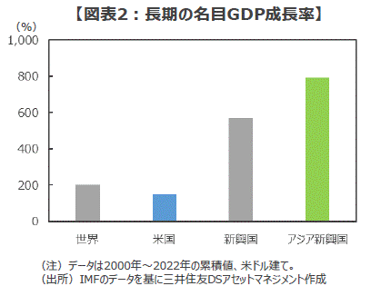 ■もちろん、こうした米国への集中も、米国経済の成長スピードが世界経済を上回っていれば大きな問題とはならないかもしれません。しかし、残念なことに2000年以降の約22年間の経済成長率を見ると、米国は約151%にとどまり、世界経済の同約202%を下回っています(図表2)。