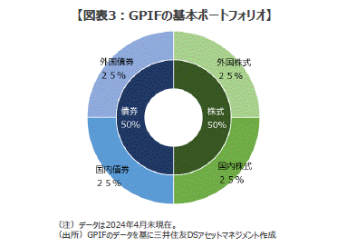 ■長期の資産形成を有利に進めるカギは、「分散投資にある」とされています。分散投資とは簡単に言うと、値動きの異なる資産を組み合わせて持つことで、資産全体の変動(リスク)を抑えながらできるだけ高いリターンを目指す投資手法のことです。例えば、私たちの国民年金や厚生年金を管理・運用する年金積立金管理運用独立行政法人(GPIF)や、世界の主要な機関投資家は「分散投資」を実践することで、長期的に有利な資産運用を行っていると考えられます(図表3)。
