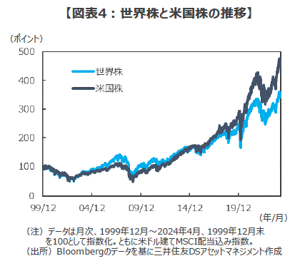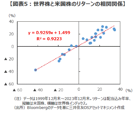■1999年末から2023年末までの24年間の世界株インデックスと米国株の推移を見ると、年率リターン(配当込み)は直感的にも、また、統計的にも極めて高い連動性が確認できます。回帰分析の結果求められる相関関係の強さを示すRスクエア(相関係数の2乗、数値は最大+1~最小▲1)は約0.92となっており、米国株と世界株インデックスのリターンは高い確率で連動する動きを続けてきたことが確認できます(図表5)。