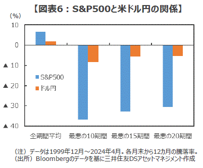 ■具体的な数字で見てみましょう。1999年12月以降の各月末を起点としたS&P500種指数と米ドル円レートの12カ月の平均騰落率は、株式が6.6%のプラス、為替が1.9%のドル高となっています。一方、同期間内で米国株のリターンが最も悪かった20期間を取ると、為替の騰落率は平均▲5.2%の米ドル安となっています。更に、最悪の10期間の平均では▲8.3%の大幅なドル安となっています(図表6)。ただでさえ外国株の下落で辛いのに、為替まで円高ドル安に振れてしまうとまさに「ダブルパンチ」となり、保有資産は手ひどい痛手を被ることになりかねません。