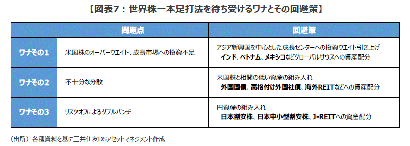 ■「米国株のオーバーウエイト」、「不十分な分散」、そして「リスクオフ局面でのダブルパンチ」といった、「世界株一本足打法」を待ち受ける3つのワナを回避するには、どうしたら良いのでしょうか。まず、米国株のオーバーウエイトの回避策ですが、世界経済の「成長エンジン」である新興国にしっかりと投資資金を振り分けることが考えられます。最近人気のインド、中国からの資本逃避の受け皿となっているベトナム、グローバル企業の米国への輸出基地となっているメキシコなど、いわゆる「グローバルサウス」へしっかりと資金を振り分けることが有力な回避策といえそうです。