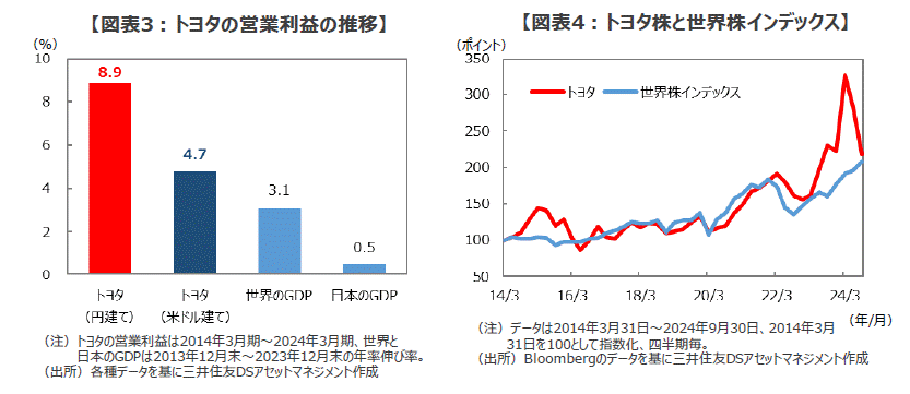 ■日本を代表するグローバル企業ともいうべきトヨタの業績は、日本の経済成長だけでなく世界経済の伸びを上回って推移しています。2013年末以降の10年間では、日本の実質GDPは年率+0.5%、世界の実質GDPは同+3.1%(米ドル建て)のペースで拡大していますが、この間トヨタの営業利益は同約+8.9%の増加、米ドル建てでも同約+4.7%の増益となっています(図表3)。