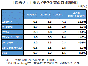 ■米国株の上昇は、中長期的な業績拡大が期待されるAI(人工知能)・半導体関連など主要ハイテク企業を中心とした成長(グロース)株がけん引役となっています。生成AIの開発に不可欠な先端半導体を手掛けるエヌビディアの時価総額は7月10日、終値ベースで世界初の4兆ドル(約590兆円)を突破しました(図表2)。足元(7月21日時点)では、AI関連需要の拡大によるクラウドサービス事業の成長が見込まれるマイクロソフトも史上最高値圏で推移しており、エヌビディアとマイクロソフトの時価総額合計(約8兆ドル)は、日本の東証株価指数(約6.7兆ドル)を凌駕しており、そのスケールの大きさを再認識させられます。