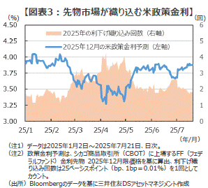 ■6月の米連邦公開市場委員会(FOMC)議事要旨によれば、ほとんどの参加者がトランプ関税による物価への影響は「一時的もしくは緩やかにとどまる見込み」で、「年内に政策金利を引き下げるのが適切」との見解を示しています。2024年12月のFOMC以降、政策金利は据え置かれていますが、弊社では年内2回(10、12月)の利下げを想定しており、市場も同様に織り込んでいるとみられます(図表3)。既に発動済みのトランプ関税は、一定のタイムラグを経て2025年7-9月期以降に景気や雇用市場を減速させるとみられるため、仮に景気・雇用関連指標が大きく悪化すれば、9月のFOMCで利下げを再開する可能性もありそうです。
