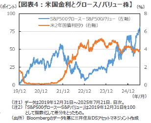 ■一般に、景気指標の悪化やインフレ率の低下により、「近い将来に利下げが行われる」との見方が広がると、米2年国債利回りは低下する傾向がみられます。米2年国債利回りと、グロース株(S&P500グロース)と割安(バリュー)株(S&P500バリュー)のリターン格差(図表4)を確認すると、金利の低下局面ではグロース株が優位となり、金利の上昇局面ではバリュー株のパフォーマンスが相対的に優位となる傾向がうかがえます。