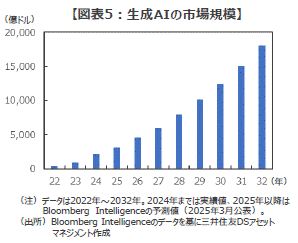 ■私たちの生活に欠かせない存在になりつつある生成AIの市場規模(ハードウェア、ソフトウェア、サービスなどの関連売上高)は急速に拡大すると予想されています。Bloomberg Intelligenceの調査によれば、2025年の生成AIの市場規模は3,139億ドル(前年比+46%)となり、2032年には約1.8兆ドルまで拡大すると予想されています(図表5)。