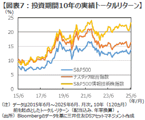 ■主要な米国株指数に10年間投資した場合の実績トータルリターン(図表7)を確認してみます。例えば、2025年6月まで10年間投資した場合の年率リターンは、S&P500情報技術株指数が+23.2%、ナスダック総合指数が+16.3%となり、S&P500(+13.6%)を上回っています。主要ハイテク企業を中心とした米グロース株が上昇基調に回帰していますが、投資期間をできるだけ「長期」とすることで短期的には大きな値動きが均され、相対的に有利なリターンを安定的に獲得する確率を高めることができそうです。