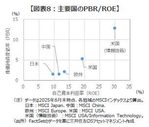 ■「株主から集めた資金を活用してどれだけ効率よく利益を稼ぎ出しているか」を示す財務指標である自己資本利益率(ROE)を確認すると、主要国の中でも米国が相対的に高く、中でも主要ハイテク企業で構成される「情報技術」の高さが際立っています(図表8)。景気サイクルを超越した「構造的成長企業」は、成長性や収益力の高さから、株価純資産倍率(PBR)といった株価評価が相対的に高まる傾向があります。