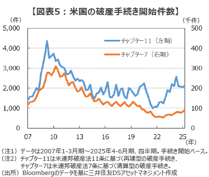 ■米国の破産手続き開始件数(図表5)の推移を見ると、2022年以降は増加傾向にあるものの、直近(2025年4-6月期)で水準が急上昇しているわけではないようです。