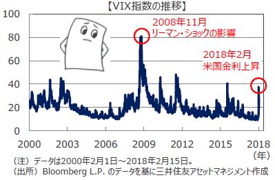 『VIX指数』とは「Volatility Index」の略称で、株価の変動性の予想を示す指数です。米国株の代表的指数の一つであるS&P500指数を対象とするオプション取引の価格を基に、シカゴ・オプション取引所(CBOE)が算出・公表しています。『VIX指数』は、15年後半から18年初まで低水準で安定的に推移してきましたが、米国金利上昇への警戒感から2月には米国株が大幅下落し、『VIX指数』は大きく変動しました。