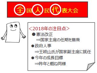 『全人代』とは、“全国人民代表大会”の略称で、中国における国会に相当します。年に1度、地方の代表らがその年の政府の施政方針を示す政府活動報告や予算案などを審議、承認します。今年は3月5日~20日に開催されました。会期は例年10日間程度ですが、今年は16日間と異例の長期間となりました。憲法改正により、習近平国家主席の長期政権が可能となり、王岐山氏が国家副主席となるなど政治面が注目されました。