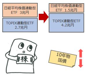 ■日銀は現在、上場投資信託(ETF)を年間6兆円のペースで買入れています。7月末の金融政策決定会合では、このETFの買入れ額の配分が変更されました。日経平均株価連動型ETF(TOPIX(東証株価指数)、日経225、JPX日経400)は3兆円から1.5兆円へ減額、TOPIX連動型ETFは2.7兆円から4.2兆円へ増額されました。