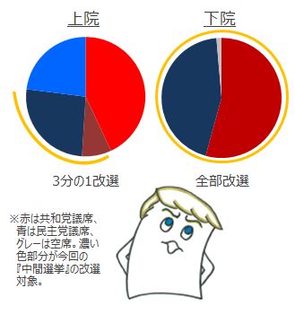 ■現在の米議会における議席数は、上院の定数100議席のうち与党共和党が51議席、民主党が49議席、下院では定数435議席のうち共和党が236議席、民主党が193議席(残り6議席は空席)と、両院とも共和党が過半数の議席を保有しています。今回の『中間選挙』では、そのうち上院34議席、下院の全議席が改選されます。