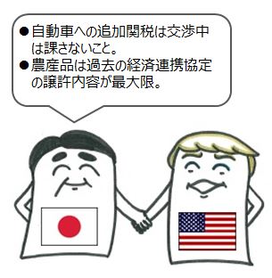 ■今回の日米首脳会談での貿易交渉では、自動車の輸入制限についてどのような合意となるかが1つの焦点でした。米国側が検討している、輸入自動車への追加関税賦課については、『TAG』の交渉中は課されないことが、首脳間で確認され、当面は追加関税賦課が見送られることになりました。ただし、交渉の進捗次第で再び米国側が主張してくることも考えられます。