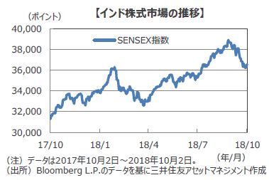■更に、9月後半には『信用不安』も嫌気されました。インドの大手ノンバンクのIL&FSは、8月下旬以降、社債などの利払いと元本償還の支払いが出来ず、デフォルトを起こしました。同社は、負債総額が126億ドル(約1.4兆円)と大きく、その約6割が他の金融機関からの借り入れであるため、インドの金融市場への負の連鎖が警戒され、銀行やノンバンク、住宅金融などの金融セクター株が大きく売られました。『信用不安』の高まりで投資家心理が悪化し、株式市場全体の下落幅が拡大しました。