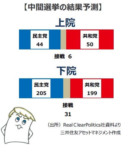 ■政治関連の調査会社RealClearPolitics社の現時点における議席獲得予想は、上院が民主党44議席、共和党50議席(残り6議席は接戦)、注目の下院は民主党205議席、共和党199議席(接戦が31議席)と、民主党がやや有利な展開です。ただし、下院では接戦区が31もあることを踏まえると、拮抗していると言えます。