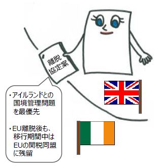 ■英国は2019年3月にEUを離脱した後、2020年末まで移行期間に入り、将来の貿易関係の締結を目指しますが、移行期間中に新しい協定が締結できない場合の予防措置として、英国がEUの関税同盟に残留することが盛り込まれました。これにより、少なくとも英国がEUの関税同盟に残留している間は、アイルランドとの国境で厳しい管理をしなくて済むようになります。
