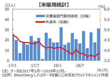 ■2018年12月の非農業部門雇用者数は、前月比31.2万人増となり、ブルームバーグ集計による市場予想の同18.4万人増を大幅に上回りました。また、11月(同17.6万人増)からも増加しました。