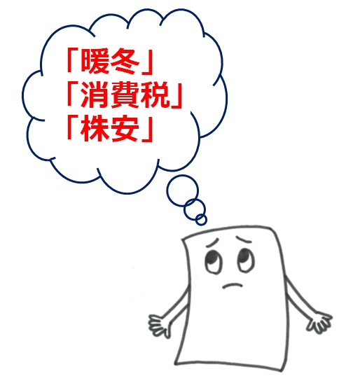 「暖冬」、「消費税」、「株安」といった単語が目立つ