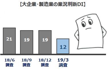 ■19年3月の『日銀短観』は、大企業・製造業の景況感を示す業況判断DIが12と、18年12月調査の19から7ポイント悪化し、市場予想の13を下回りました。また、3カ月後の先行きの同DIは、4ポイント悪化の8が見込まれています。海外景気の減速や米中貿易摩擦が景況感の大幅悪化につながったとみられます。