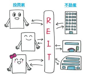 ■リートとは「不動産投資信託」のことを言います。投資家から集めた資金を不動産(オフィスビル、商業施設、賃貸マンション等)に投資し、維持・管理や必要に応じて買い替え等を行うことで得られた賃料収入や不動産の売却益等を投資家に配当する仕組みです。
