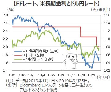 ■7月末にFRBは2.50%から2.25%へ約10年ぶりとなる利下げを実施しました。8月12日にドル円レートは105.30円まで米ドル安・円高が進み、9月3日には米10年国債利回りが1.46%まで低下しました。ところが、9月18日に行われた追加利下げの後は、むしろ米10年国債利回りは上昇し9月25日現在で1.74%となり、ドル円レートも107.77円と『米ドル高』・円安となっています。