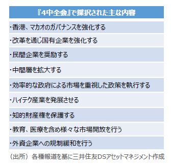 ■『4中全会』では、主に共産党一党支配の統治システムの強化などが示されたほか、米中貿易摩擦の関連では、知的財産権の保護、様々な市場開放、外資企業への規制緩和といった米国の求めに沿った項目が採択されました。一方、ハイテクを巡る覇権争いで米国が要求している国有企業や産業補助金の改革については、中国は妥協しないとみられます。米中両政府は、10月に行われた閣僚級協議で「第1弾」の部分合意に達していますが、今後の米中協議の進展が注目されます。