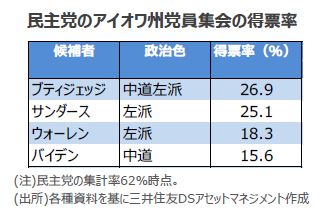 ■民主党は党員集会の集計が混乱し、4日午後に最初の発表(集計率62%)を行いました。それによると、若手のブティジェッジ前サウスベンド市長(中道左派)がトップ、サンダース上院議員(左派)が2位、ウォーレン上院議員(左派)が3位、バイデン前副大統領(中道)が4位と、上位4人の混戦となっています。