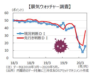 「景気ウォッチャー調査」、いわゆる『街角景気』とは、景気に敏感なタクシー運転手や小売店、メーカー、輸送業、広告代理店など、地域の景気の動きを敏感に観察できる立場にある約2,000人を対象とした調査です。5月の『街角景気』は、緊急事態宣言の解除を受けて現状判断指数(DI)、先行き判断指数(DI)ともに上昇に転じ、現状判断指数(DI)は首都圏で外出自粛要請が出された3月の水準を回復しました。