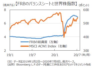 ■国際通貨基金(IMF)によれば、2020年の世界の経済成長率は▲4.9%が予想されるなど、世界経済は新型コロナウイルスの影響で停滞が続き、以前の水準に戻るのに数年かかるという見方が一般的です。それでも株式市場で強気な見方が保たれているのは、中央銀行への信頼が厚いためだと考えられます。低成長が見込まれる中、日米欧の主要中央銀行を中心に異例の金融緩和策が長期化することが予想され、量的緩和によって過去にないペースで『バランスシート』が拡大するとの期待が市場心理を支えそうです。