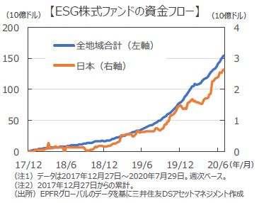 ■米国の金融商品の調査会社であるEPFRグローバルによると、ESG株式ファンドへは2019年以降資金流入が加速しており、2017年末からの累計額は7月29日時点で1,500億ドル(約16兆円)を超えています。