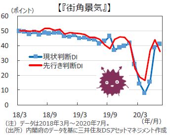 ■7月の『街角景気』によると、現状判断DI(季節調整値)は前月比2.3ポイント上昇の41.1となり、3カ月連続で改善しました。項目別にみると、出遅れていた企業動向関連、雇用関連が回復し、家計動向関連は横ばいでした。
