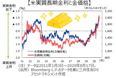 ■『金価格』はコロナ禍以降、7月には約9年ぶりに史上最高値を更新し、8月には1トロイオンス=2,000米ドル台に上昇しました。年初からの上昇率は31%(8月17日現在)となっています。背景にはコロナ禍による景気先行き懸念からの安全資産への需要の高まり、米ドル安、各国金融緩和による通貨価値の下落やインフレへの懸念などがあげられます。『金価格』は米実質長期金利がマイナス1%前後まで低下したことに伴い大幅に上昇しました。2015-2016年の中国ショック時に、米国の量的緩和縮小によって実質金利が大きく上昇し、『金価格』が大幅に下落した際と極めて対照的な動きとなっています。