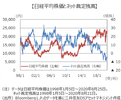 ■テクニカル指標は、あまり過熱感を示す指標はみられません。一方需給関連指標をみると、ネット裁定残高はボトムの5月25日の▲8.85億株からは縮小していますが、8月21日で▲4.04億株と異例な状況にあり、ショートポジションはなお高水準にあると言えます。