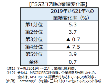 ■ESG評価の高低と業績の関係について見てみます。具体的には、MSCI ACWI採用企業をESGスコア順に5つに分け、それぞれの今年と来年の純利益の予想を2年分通算して業績の変化率を計算しました。それによると、概ね、ESG評価の高い順に2年間の業績の伸びが高くなっています。これがESG評価が高い企業群の今年の株式リターンの高さの背景になっている可能性があります。