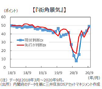■9月の『街角景気』によると、現状判断DI(季節調整値)は前月比5.4ポイント上昇し49.3と5カ月連続の改善となりました。新型コロナの感染再拡大がやや落ち着きつつあることやGo To トラベルの影響などからあらゆる分野が明るさを取り戻してきていることが伺えます。項目別では家計動向関連、企業動向関連、雇用関連の全てが改善しましたが、家計動向関連の飲食、住宅などの改善が目立ちました。