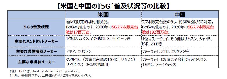 ■高速、低遅延性、多数同時接続を特徴とする『5G』の本格的な普及が見込まれており、各国は実用化を進めています。『5G』の主導権を巡り米中の対立は激しさを増していますが、政府・企業間の調整等が難しい米国に比べ、国策として『5G』を進める中国が優勢な状況になっています。2020年末の世界の『5G』対応携帯の販売台数では、中国のシェアが80%強と見込まれており、突出しています。