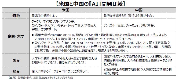 ■2020年現在、基礎研究においては米国と中国の差はほとんどないと言われています。個⼈データ利⽤の制限の少なさが中国の『AI』研究の有利な点との指摘もあり、顔認証の『AI』システム開発などの⾯では中国の開発が米国に先⾏しているというのが一般的な見方です。