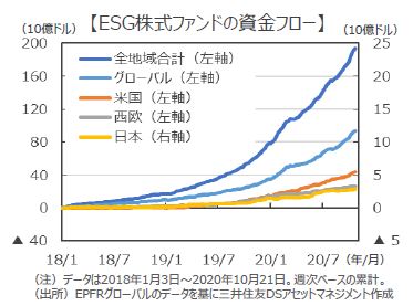 ■米国に本社を置く金融調査会社であるEPFRグローバルによると、このところ日本株への『ESG投資』の資金流入は加速していますが、金額的には米欧やグローバル株式と比較すると極端な少額にとどまっています。日本企業に対するESG評価が国際的に標準的な水準にあることを勘案すると、日本企業に対する『ESG投資』は、今後、資金流入が加速する余地が大きいと考えられます。そのためには、企業自らがESG面の取り組みのアピールを一層強化するなど、投資家に対する働きかけの積極化が進むことが望まれます。