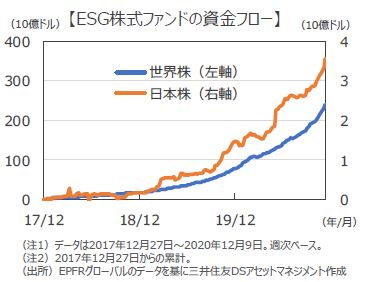 ■米国の金融商品の調査会社であるEPFRグローバルによると、世界のESG株式ファンドへの資金フローは2020年に資金流入が加速しており、2017年末からの累計額は12月9日時点で約2,400億ドルとなっています。