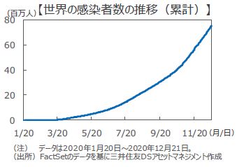 ■2019年12月、中国湖北省武漢において原因不明の肺炎患者が複数確認されました。世界保健機構(WHO)は2020年1月14日、この症状を新型『コロナ』ウイルスによるものとし、同月30日には国際的な緊急事態を宣言しました。その後、『コロナ』感染は日本をはじめとしたアジア地域を経て全世界に広がり、3月以降は一部欧米主要国におけるロックダウン(都市封鎖)が実施されるまでに至りました。累計感染者数は12月21日現在、世界全体で7,500万人を超えています。