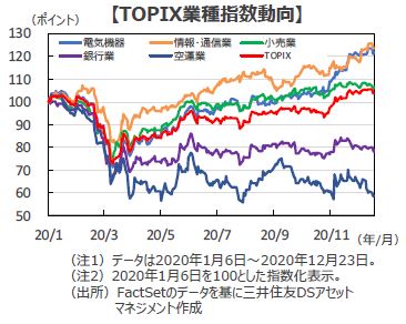 ■2020年の株式市場は新型コロナの影響を大きく受けた一年となりました。東証株価指数(TOPIX)はコロナ禍により一時年初来30%近い下落となりましたが、足元は若干のプラスとなっています。但し、その中身を見ると新型コロナがもたらすニューノーマルへの適応度合いや業績動向の差から、『2極化』が進展しました。