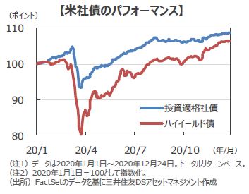 ■しかし、FRBが社債購入プログラムを含む大規模な追加金融緩和策を打ち出したことで、『米社債市場』は反発に転じました。その後は、経済再開に伴う景気回復や大規模緩和の長期化観測に加えて、コロナワクチンの実用化期待から『米社債市場』は堅調に推移し、右肩上がりの上昇基調を辿っています。足元の年初来騰落率は、ハイイールド債が+6.6%、投資適格社債が+8.7%と、良好です(12月24日時点)。