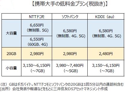 ■大手3社の低料金プランでは、ソフトバンクは大容量プランで次世代通信規格5G、4Gともに月額6,580円(税抜き)とし、5Gでは現行より約2割安くしました。通信量も50GB(ギガは10億)から無制限に増やしました。他2社も値下げし、ほぼ同水準となりました。