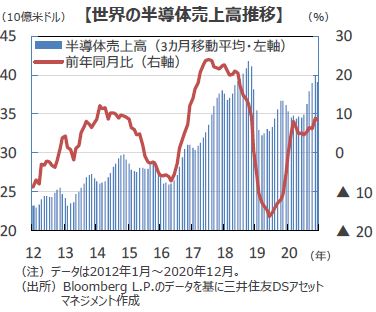 ■足元、『半導体需要』が急拡大し、供給が追い付かない状況となっています。半導体受託生産で世界トップの台湾積体電路製造(TSMC)は、今10‐12月期に四半期として過去最高の売上高と純利益を計上しており、ルネサスエレクトロニクスや東芝は久しぶりに一斉の製品値上げに動いています。