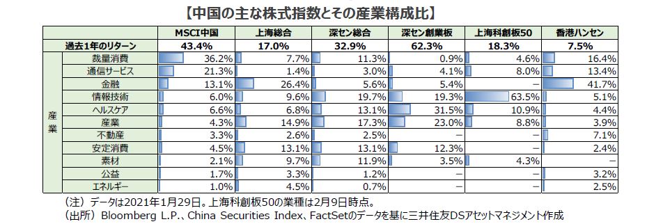 ■バラエティに富む『中国の株式市場』ですが、指数の産業構成比を見るとその特徴がよく表れています。新しい中国の状況は、MSCI中国や深セン市場によく表れると推察されますので、特に注目です。