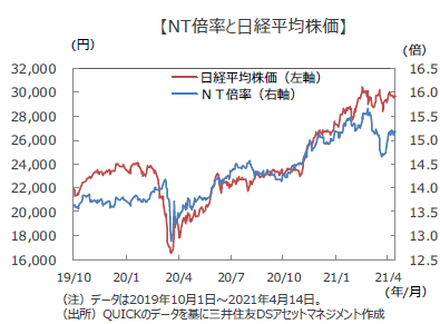 日本の株式市場は、米国の大型景気対策や新型コロナワクチン接種拡大などから上昇傾向が続いています。日経平均株価を東証株価指数(TOPIX)で割り、両指数の相対的な強さを示す『NT倍率』は2月25日には15.66倍まで上昇しました。その後は日本銀行の上場投資信託(ETF)の新規組み入れTOPIX一本化を受けて一時急低下するなど、足元では方向感の乏しい展開となっています。
