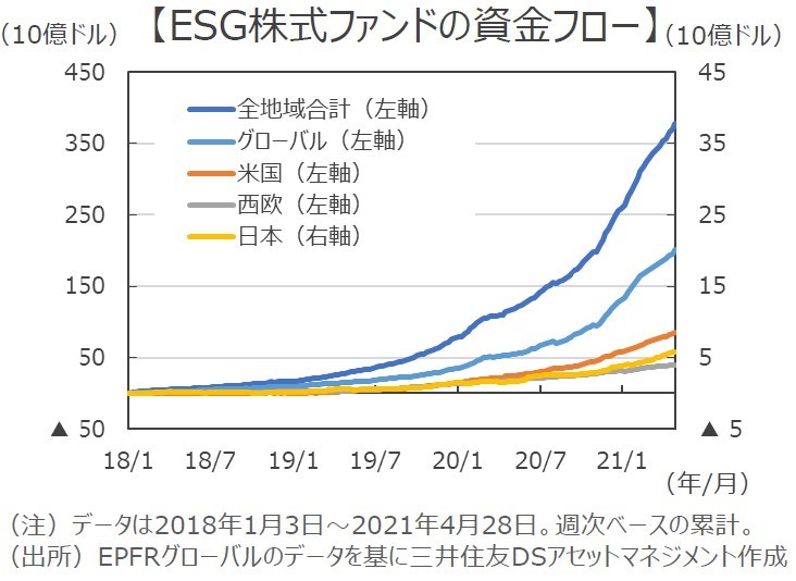 ■環境、社会的責任、企業統治といった非財務情報に着目したESG投資が、世界的に拡大しています。米国の調査会社EPFRグローバルによれば、ESG関連株式ファンド(投資信託)への資金流入は2018年以降の累計(4月28日時点)で約3,800億ドル(約41兆円)に達しています。