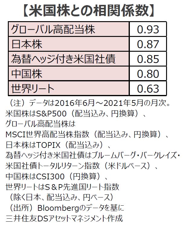 ■米国株との『相関係数』(月次ベース、5年)を見たのが右の表です。株式の『相関係数』は総じて高めですが、グローバル高配当株や日本株と比べると中国株は米国株との『相関係数』が低くなっています。世界リートの米国株との『相関係数』は株ほど高くありません。
